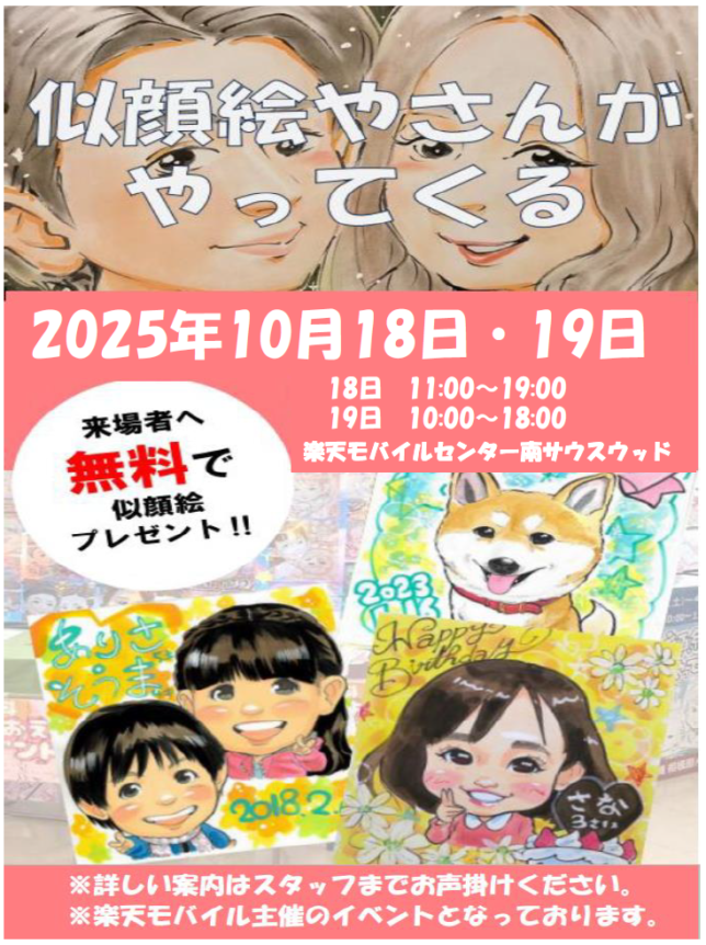 サウスウッド/SHOPインフォメーション2025.10.16 【楽天モバイル】似顔絵を描いてもらおう! サウスウッド1F・楽天モバイルに似顔絵やさんがやってくる!かわいい似顔絵を描いてもらいませんか? ◆日時 10/18(土)11:00-19:00 10/19(日)10:00-18:00 ◆会場 サウスウッド1F・楽天モバイル店内 ◆参加費 無料/詳しくは店舗スタッフへお声掛けください