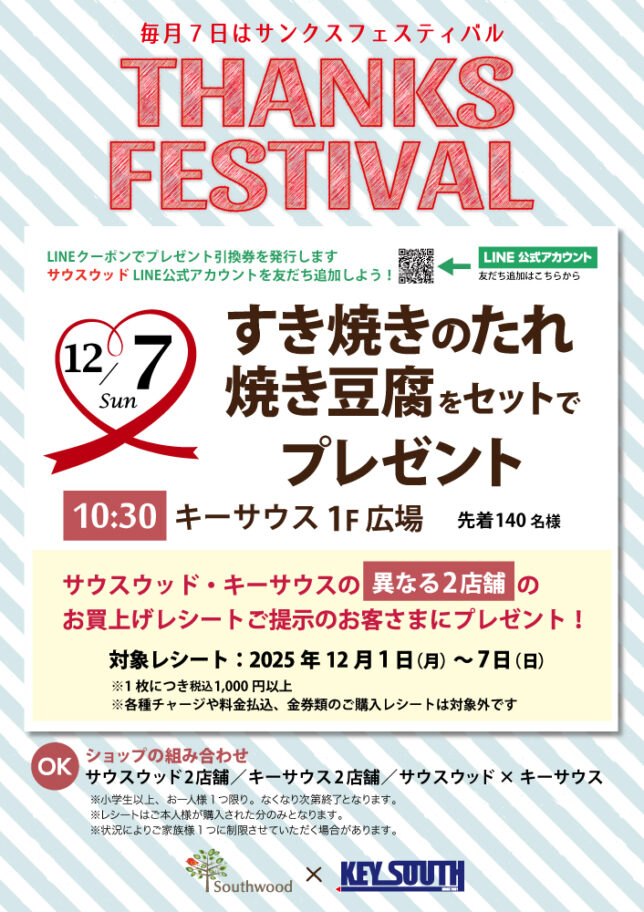 サウスウッド・キーサウスの異なる2店舗のお買い上げレシートご提示でプレゼントを差し上げます。
