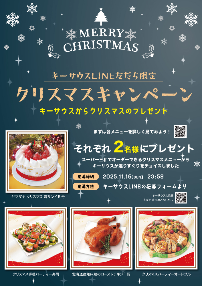 スーパー三和・クリスマスパーティーメニューより、抽選でケーキまたはパーティーメニューを差し上げます。