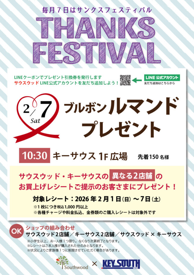 サウスウッド・キーサウスの異なる2店舗のお買い上げレシートご提示でプレゼントを差し上げます。