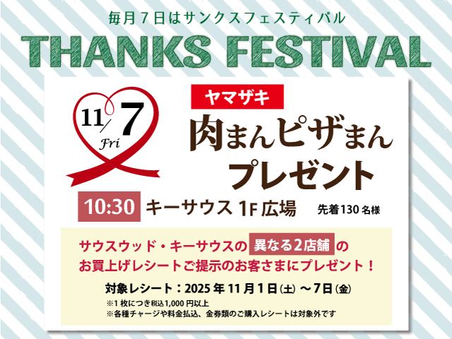 2025.10.23サウスウッドからのお知らせサウスウッド/SHOPインフォメーションキーサウスからのお知らせキーサウス/SHOPインフォメーション 11月のサンクスフェスティバルは 毎月7日はサンクスフェスティバルの日!サウスウッド・キーサウスの異なる2店舗のお買い上げレシートご提…