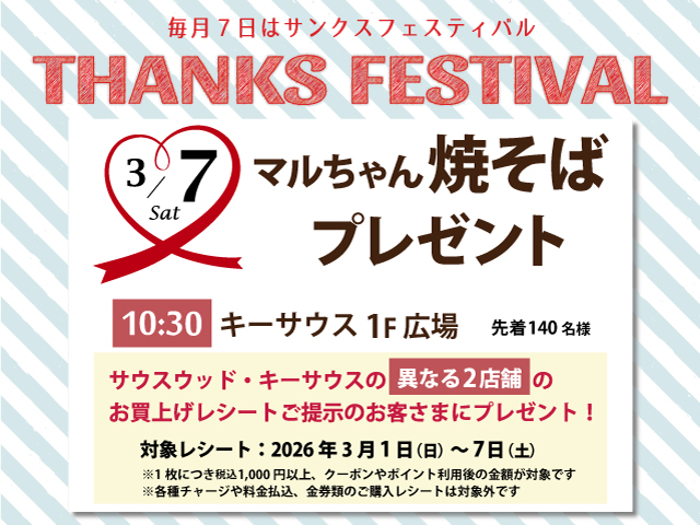2026.02.17サウスウッドからのお知らせサウスウッド/SHOPインフォメーションキーサウスからのお知らせキーサウス/SHOPインフォメーション 3月のサンクスフェスティバルは 毎月7日はサンクスフェスティバルの日!サウスウッド・キーサウスの異なる2店舗のお買い上げレシートご提…