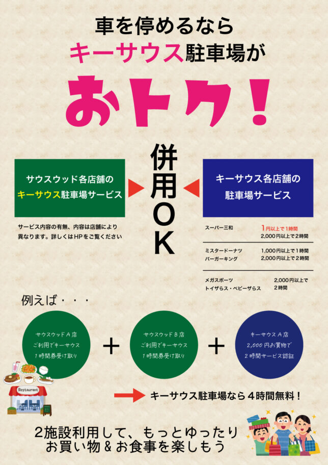 キーサウス駐車場をご利用の場合、「サウスウッド各店舗のキーサウス駐車場サービス」と「キーサウス各店舗の駐車場サービス」が併用できます。2施設利用して、もっとゆったりお買い物&お食事を楽しもう♪